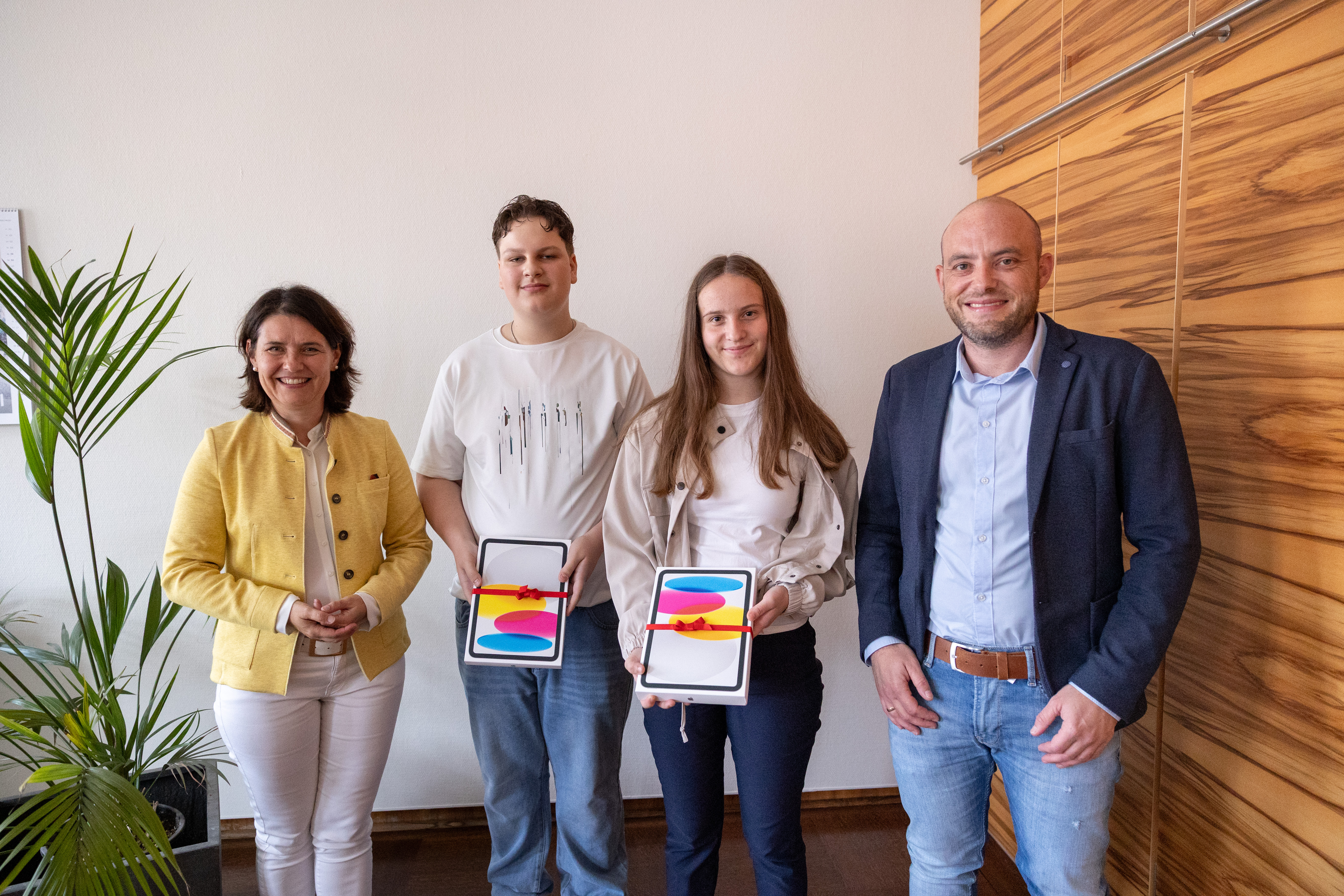 Foto Yasemin Ikibas: (von links nach rechts): Landrätin Sabine Sitter überreichte hochwertige Tablets an Milan Duric und Lina Rosel, die Gewinner der Verlosungsaktion der Berufsinformationstage 2025. Sebastian Gehret (Sachgebietsleiter Bildung, Sport und Kultur) vom Arbeitskreis BIT freut sich mit den Jugendlichen.